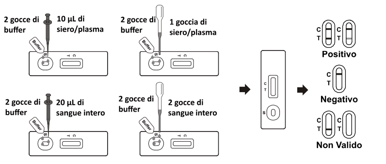 Utilizzare una micropipetta : pipettare e dispensare 10μL di siero/plasma o 20μL di sangue intero nel pozzetto del campione (S) della cassetta del test, quindi aggiungere 2 gocce di Buffer (circa 80μL) e avviare il timer.